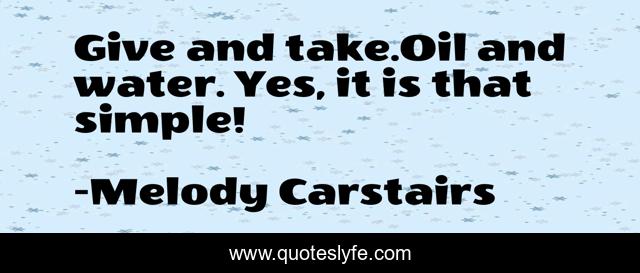 This page presents the quote "Give and take.Oil and water. Yes, it is that simple!". Author of this quote is Melody Carstairs. This quote is about sharing, love, honesty, giving, respecting-yourself, give-and-take, loyalty, together, respecting-others,.