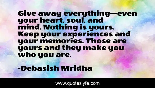 This page presents the quote "Give away everything—even your heart, soul, and mind. Nothing is yours. Keep your experiences and your memories. Those are yours and they make you who you are.". Author of this quote is Debasish Mridha. This quote is about philosophy, give-away-everything, memories-make-you-who-you-are, debasish-mridha, keep-your-memories, quotes, debasish-mridha-md, inspirational, enthusiasm,.
