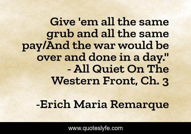 This page presents the quote "Give 'em all the same grub and all the same pay/And the war would be over and done in a day." - All Quiet On The Western Front, Ch. 3". Author of this quote is Erich Maria Remarque. .