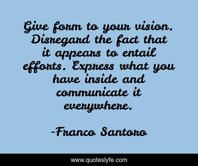This page presents the quote "Give form to your vision. Disregard the fact that it appears to entail efforts. Express what you have inside and communicate it everywhere.". Author of this quote is Franco Santoro. This quote is about vision, manifestation,.