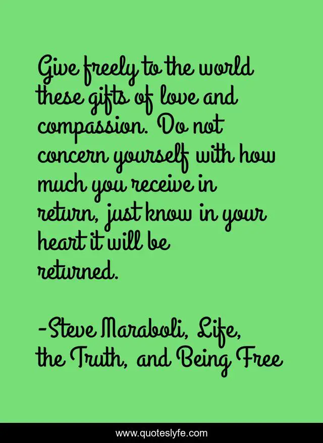 This page presents the quote "Give freely to the world these gifts of love and compassion. Do not concern yourself with how much you receive in return, just know in your heart it will be returned.". Author of this quote is Steve Maraboli, Life, the Truth, and Being Free. This quote is about life, compassion, gifts, giving, inspirational, helping-others, enthusiasm, kindness,.