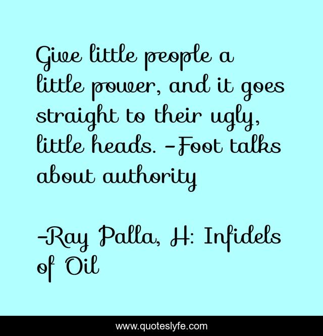 This page presents the quote "Give little people a little power, and it goes straight to their ugly, little heads. -Foot talks about authority". Author of this quote is Ray Palla, H: Infidels of Oil. This quote is about little-head, ugly, authority, little-people, power,.