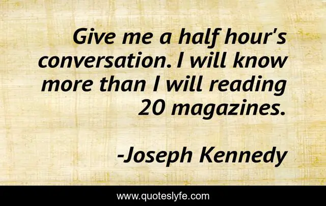 This page presents the quote "Give me a half hour's conversation. I will know more than I will reading 20 magazines.". Author of this quote is Joseph Kennedy. This quote is about conversation, listening,.