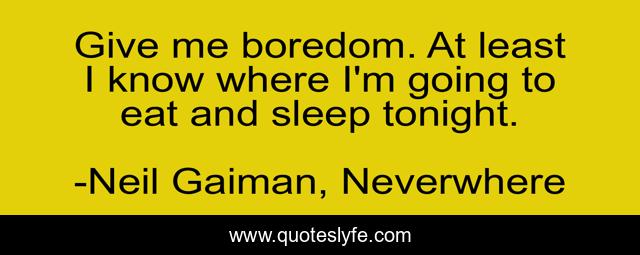 This page presents the quote "Give me boredom. At least I know where I'm going to eat and sleep tonight.". Author of this quote is Neil Gaiman, Neverwhere. .