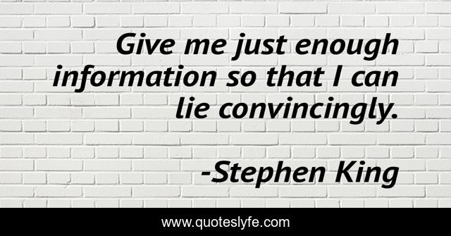 This page presents the quote "Give me just enough information so that I can lie convincingly.". Author of this quote is Stephen King. This quote is about king, horror, on-writing, stephen-king,.