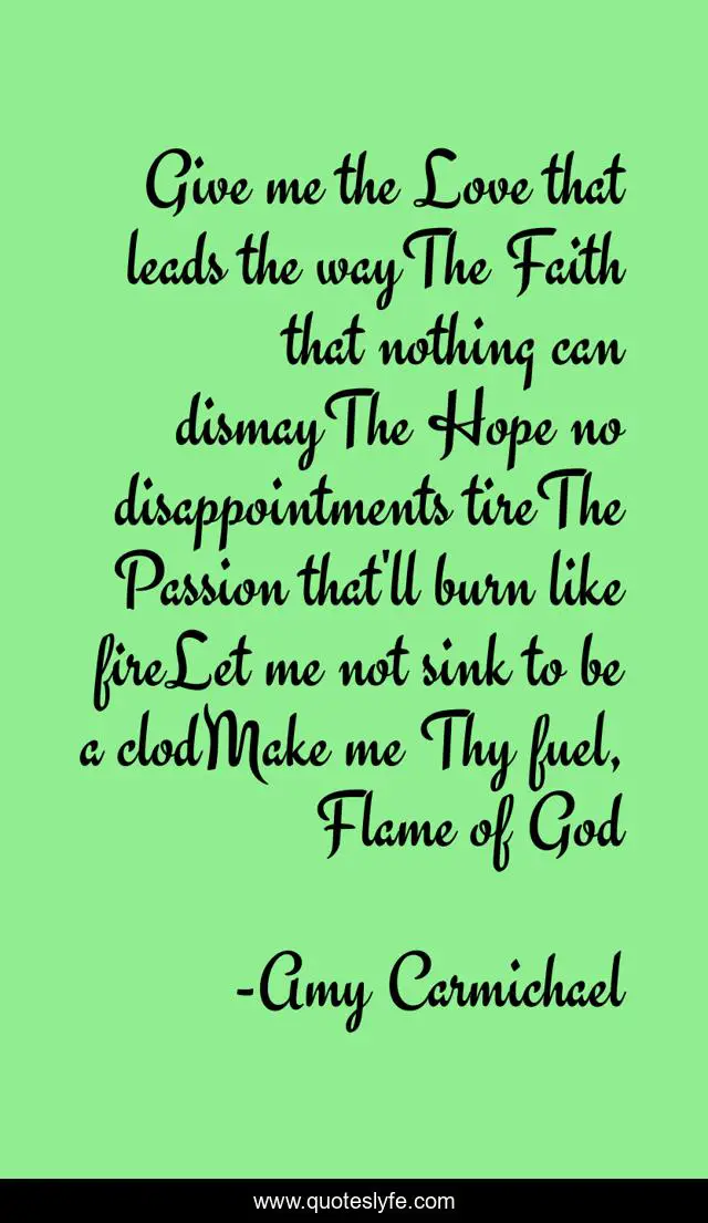 This page presents the quote "Give me the Love that leads the wayThe Faith that nothing can dismayThe Hope no disappointments tireThe Passion that'll burn like fireLet me not sink to be a clodMake me Thy fuel, Flame of God". Author of this quote is Amy Carmichael. This quote is about love, god, inspirational, prayer, enthusiasm, affection,.