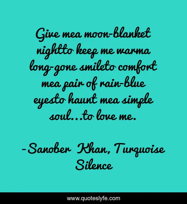 This page presents the quote "Give mea moon-blanket nightto keep me warma long-gone smileto comfort mea pair of rain-blue eyesto haunt mea simple soul...to love me.". Author of this quote is Sanober Khan, Turquoise Silence. This quote is about love, desires, blanket, comfort, poetry, haunt, moon, moonlight, warm,.