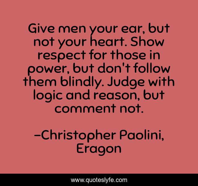 This page presents the quote "Give men your ear, but not your heart. Show respect for those in power, but don't follow them blindly. Judge with logic and reason, but comment not.". Author of this quote is Christopher Paolini, Eragon. This quote is about garrow, inheritance, eragon, intelligence, advice, wisdom, quotes-on-life, inspirational, enthusiasm,.