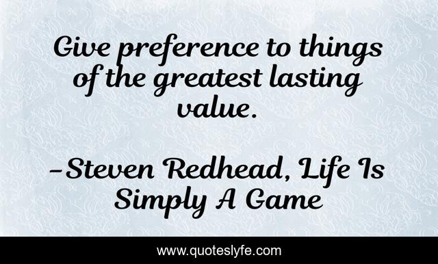 This page presents the quote "Give preference to things of the greatest lasting value.". Author of this quote is Steven Redhead, Life Is Simply A Game. This quote is about lasting-value, greatest, value, preferences,.