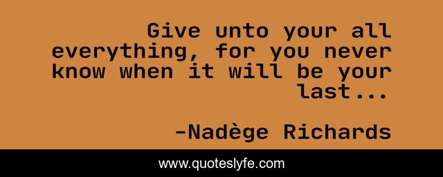 This page presents the quote "Give unto your all everything, for you never know when it will be your last...". Author of this quote is Nadège Richards. This quote is about faith, life, uplifting, god, inspirational, enthusiasm,.