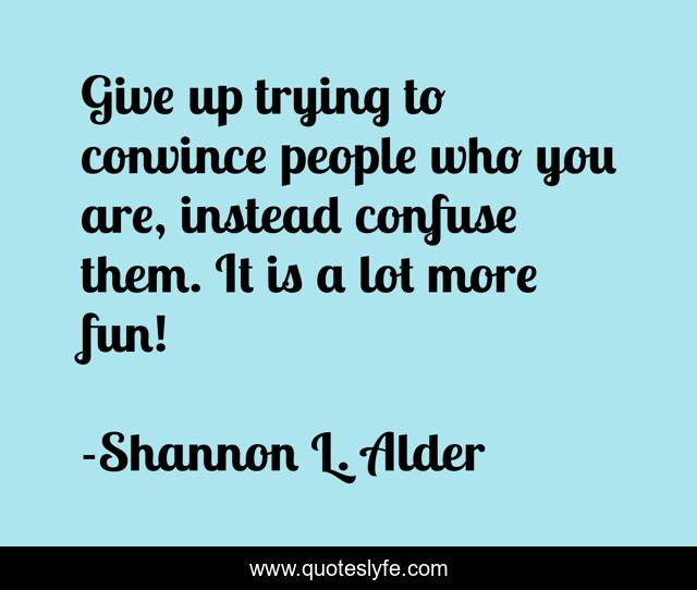 This page presents the quote "Give up trying to convince people who you are, instead confuse them. It is a lot more fun!". Author of this quote is Shannon L. Alder. This quote is about confuse, play, humor,.