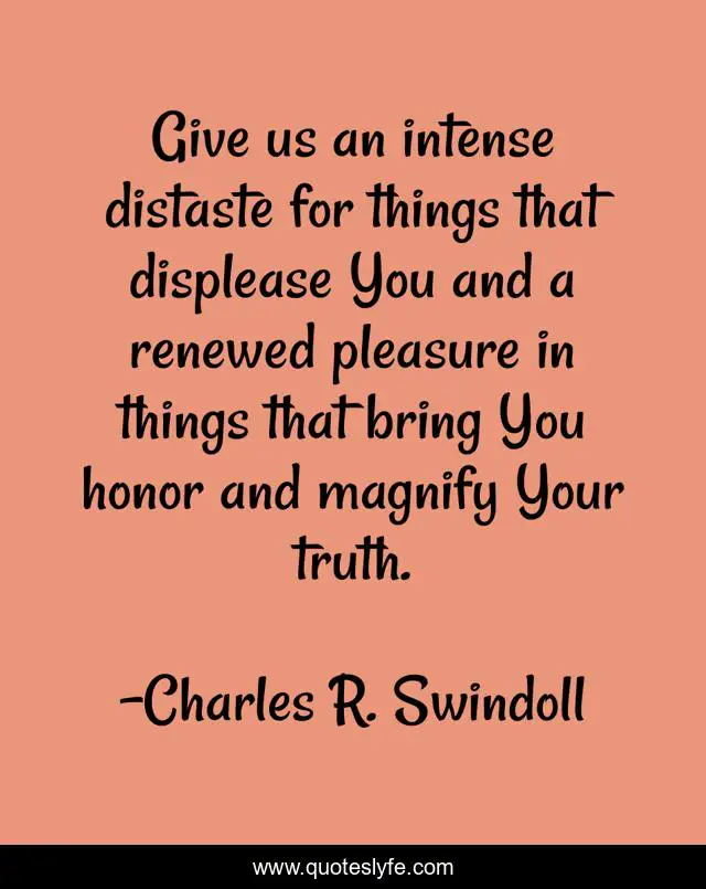 This page presents the quote "Give us an intense distaste for things that displease You and a renewed pleasure in things that bring You honor and magnify Your truth.". Author of this quote is Charles R. Swindoll. This quote is about prayer, corruption, truth, temptation,.