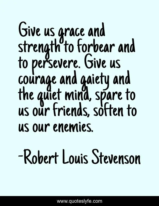 This page presents the quote "Give us grace and strength to forbear and to persevere. Give us courage and gaiety and the quiet mind, spare to us our friends, soften to us our enemies.". Author of this quote is Robert Louis Stevenson. This quote is about friends, courage, mind,.