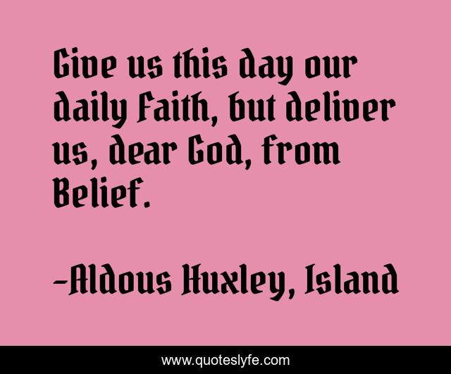 This page presents the quote "Give us this day our daily Faith, but deliver us, dear God, from Belief.". Author of this quote is Aldous Huxley, Island. This quote is about island, metaphysical-beliefs, huxley, inspirational, enthusiasm, metaphysics,.