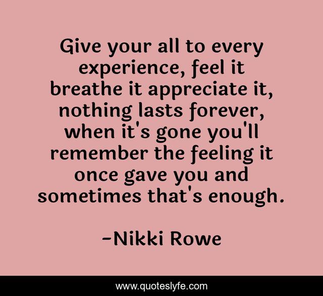 This page presents the quote "Give your all to every experience, feel it breathe it appreciate it, nothing lasts forever, when it's gone you'll remember the feeling it once gave you and sometimes that's enough.". Author of this quote is Nikki Rowe. This quote is about life, love, destiny, fate, journey, purpose, experience, inner-being, move-forward,.