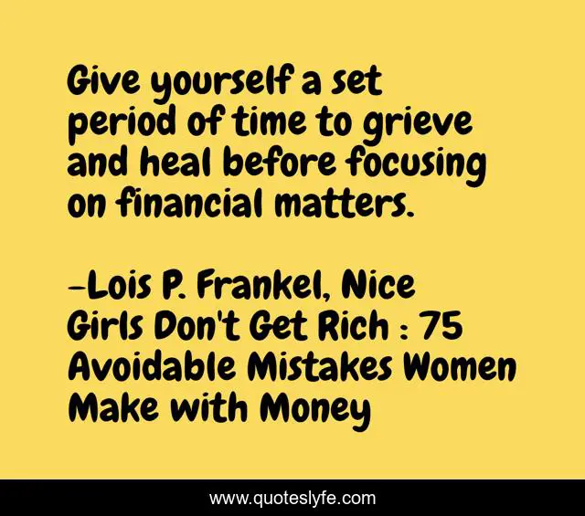 This page presents the quote "Give yourself a set period of time to grieve and heal before focusing on financial matters.". Author of this quote is Lois P. Frankel, Nice Girls Don't Get Rich : 75 Avoidable Mistakes Women Make with Money. This quote is about grief, loss, money-management, money,.