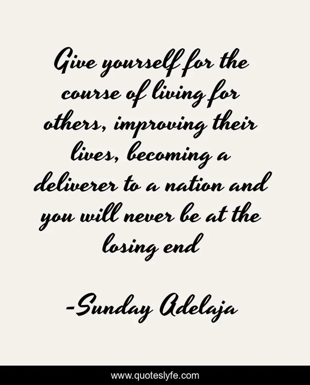 This page presents the quote "Give yourself for the course of living for others, improving their lives, becoming a deliverer to a nation and you will never be at the losing end". Author of this quote is Sunday Adelaja. This quote is about living, improving, give, nation, course, lives, deliverer, losing,.