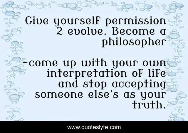 This page presents the quote "Give yourself permission 2 evolve. Become a philosopher". Author of this quote is come up with your own interpretation of life and stop accepting someone else's as your truth.. .