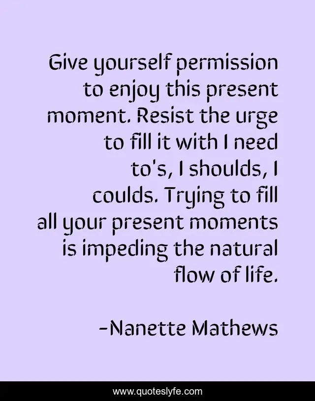 "Nanette Mathews Quotes." Quoteslyfe.com, 2025. Sun. 07 Dec. 2025. <https://www.quoteslyfe.com/quote/Give-yourself-permission-to-enjoy-this-present-155631>.