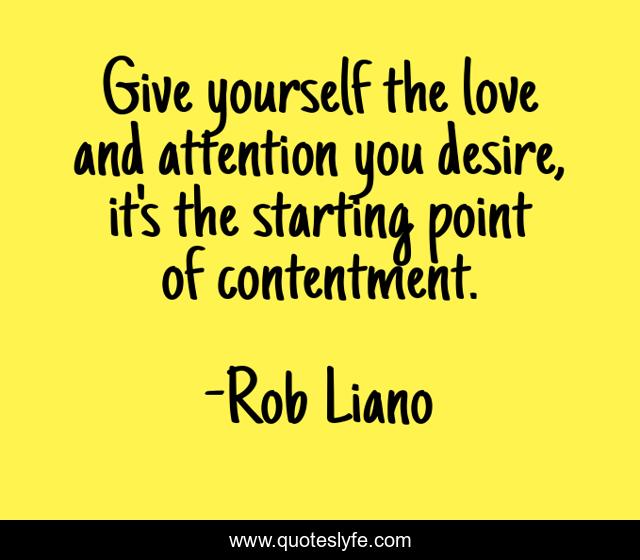 This page presents the quote "Give yourself the love and attention you desire, it's the starting point of contentment.". Author of this quote is Rob Liano. This quote is about self-love, peace, happinbess, positive, motivational, spiritual, self-worth, quotes, contentment,.