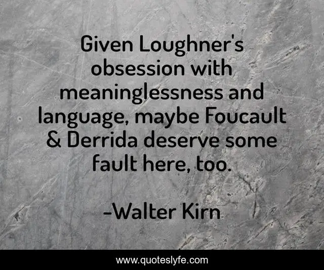 This page presents the quote "Given Loughner's obsession with meaninglessness and language, maybe Foucault & Derrida deserve some fault here, too.". Author of this quote is Walter Kirn. This quote is about language, 2011-tuscon-shooting, twitter, jacques-derrida, michel-foucault, jared-lee-loughner, blame-game, 2011,.