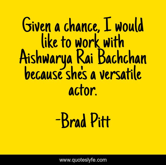 This page presents the quote "Given a chance, I would like to work with Aishwarya Rai Bachchan because she's a versatile actor.". Author of this quote is Brad Pitt. This quote is about work, she, actor,.