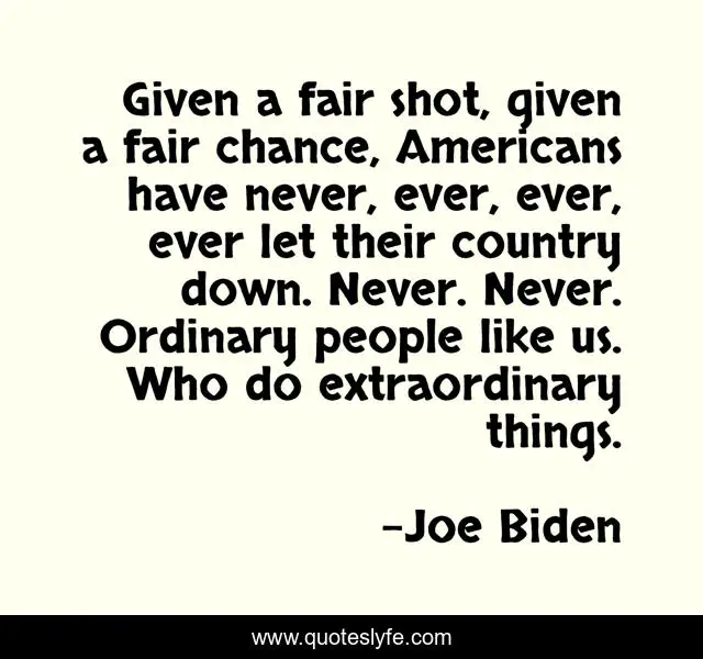This page presents the quote "Given a fair shot, given a fair chance, Americans have never, ever, ever, ever let their country down. Never. Never. Ordinary people like us. Who do extraordinary things.". Author of this quote is Joe Biden. This quote is about down, extraordinary, people,.