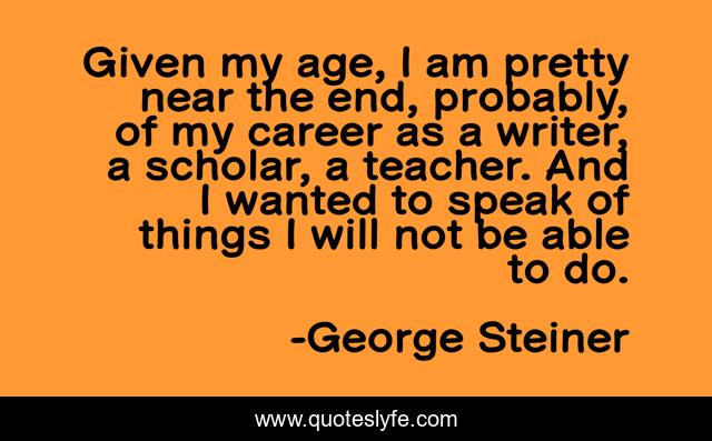 This page presents the quote "Given my age, I am pretty near the end, probably, of my career as a writer, a scholar, a teacher. And I wanted to speak of things I will not be able to do.". Author of this quote is George Steiner. This quote is about age, speak,.