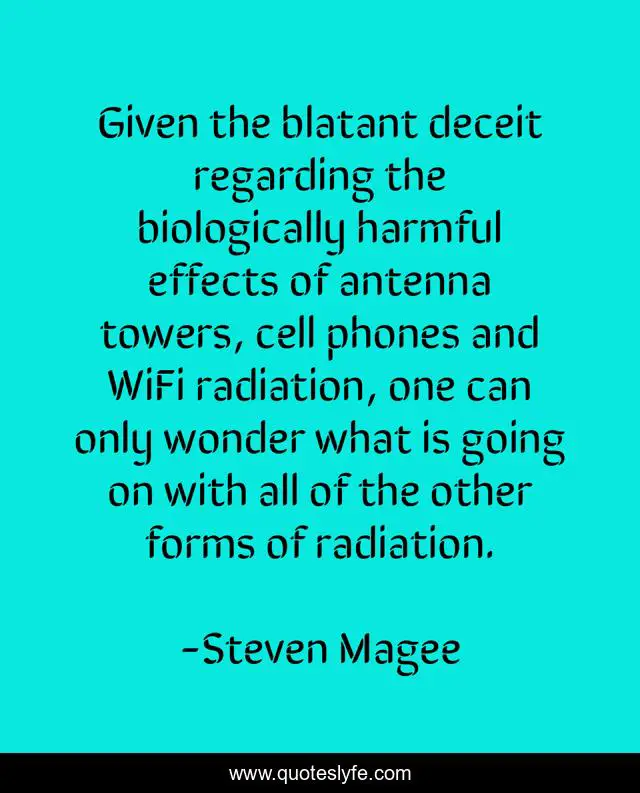 This page presents the quote "Given the blatant deceit regarding the biologically harmful effects of antenna towers, cell phones and WiFi radiation, one can only wonder what is going on with all of the other forms of radiation.". Author of this quote is Steven Magee. This quote is about cell, harmful, given, antenna, towers, phones, biologically, wifi, radiation,.