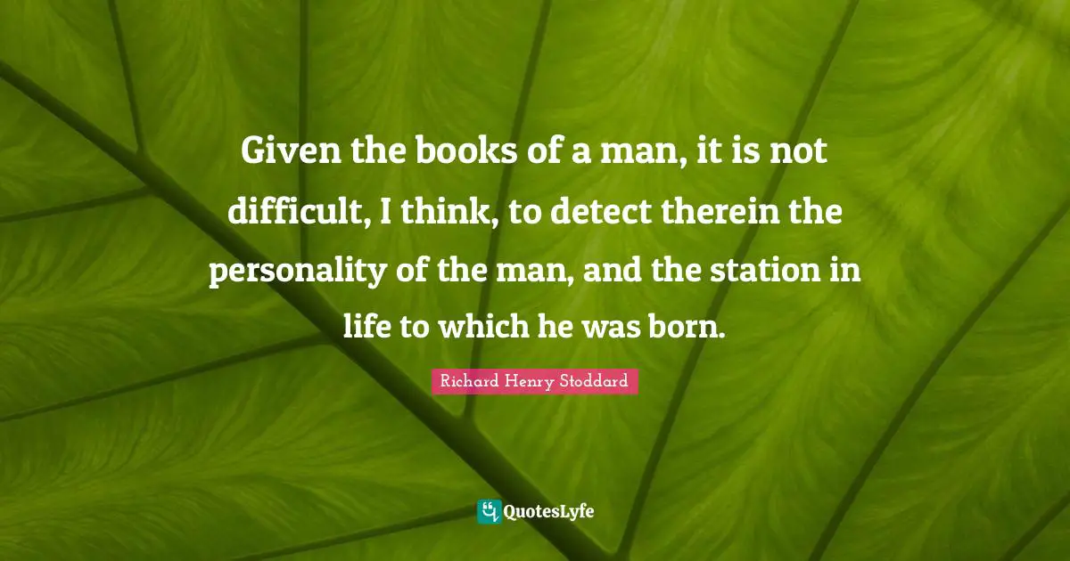 This page presents the quote "Given the books of a man, it is not difficult, I think, to detect therein the personality of the man, and the station in life to which he was born.". Author of this quote is Richard Henry Stoddard. This quote is about men, life, personality, difficult, given, born, reading, book,.