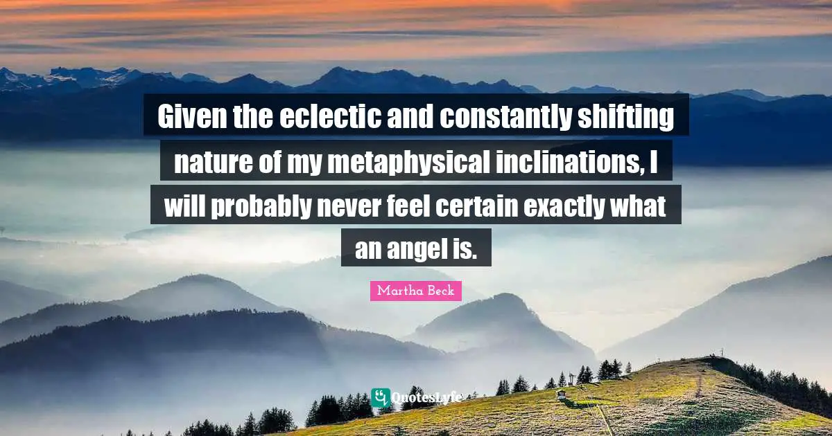 This page presents the quote "Given the eclectic and constantly shifting nature of my metaphysical inclinations, I will probably never feel certain exactly what an angel is.". Author of this quote is Martha Beck. This quote is about angel, metaphysical, given, certain, shifting, nature, eclectic,.