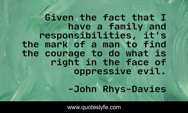 This page presents the quote "Given the fact that I have a family and responsibilities, it's the mark of a man to find the courage to do what is right in the face of oppressive evil.". Author of this quote is John Rhys-Davies. This quote is about family, evil, man,.