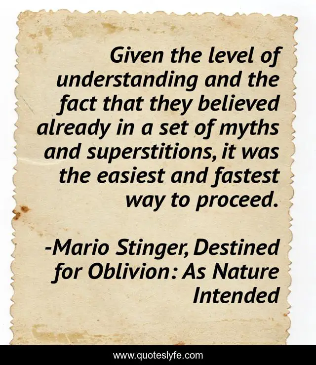 This page presents the quote "Given the level of understanding and the fact that they believed already in a set of myths and superstitions, it was the easiest and fastest way to proceed.". Author of this quote is Mario Stinger, Destined for Oblivion: As Nature Intended. This quote is about atheism, religion, confirmation-bias, agenticity,.