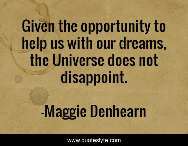This page presents the quote "Given the opportunity to help us with our dreams, the Universe does not disappoint.". Author of this quote is Maggie Denhearn. This quote is about motivation, joy, positivity, universe, quote, happiness, inspiration,.