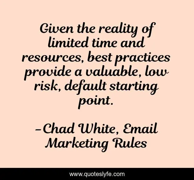 This page presents the quote "Given the reality of limited time and resources, best practices provide a valuable, low risk, default starting point.". Author of this quote is Chad White, Email Marketing Rules. This quote is about marketing, business, marketing-advice,.