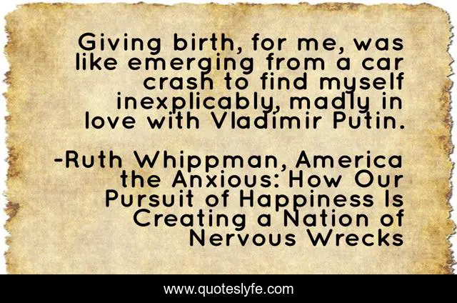 This page presents the quote "Giving birth, for me, was like emerging from a car crash to find myself inexplicably, madly in love with Vladimir Putin.". Author of this quote is Ruth Whippman, America the Anxious: How Our Pursuit of Happiness Is Creating a Nation of Nervous Wrecks. This quote is about parenting, ekhart-tolle, happiness,.