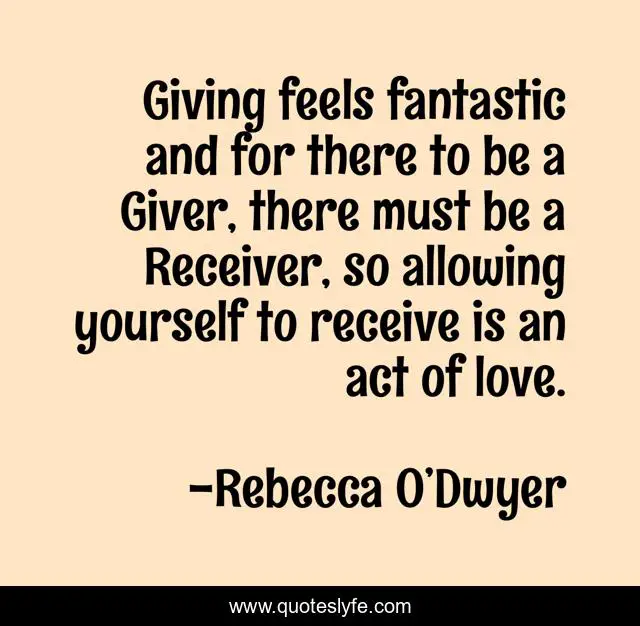 This page presents the quote "Giving feels fantastic and for there to be a Giver, there must be a Receiver, so allowing yourself to receive is an act of love.". Author of this quote is Rebecca O’Dwyer. This quote is about love, giving, giving-and-receiving, giver, receiver, receiving, affection,.