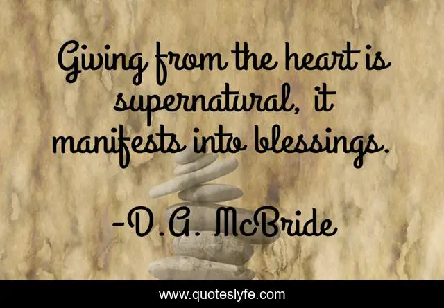 This page presents the quote "Giving from the heart is supernatural, it manifests into blessings.". Author of this quote is D.A. McBride. This quote is about enthusiasm, christian-living, inspirational,.