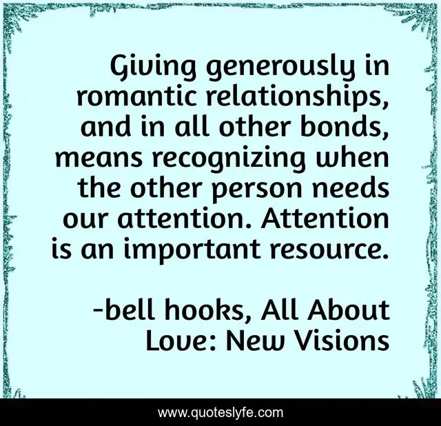 "bell hooks, All About Love: New Visions Quotes." Quoteslyfe.com, 2025. Fri. 05 Dec. 2025. <https://www.quoteslyfe.com/quote/Giving-generously-in-romantic-relationships-and-in-17795>.