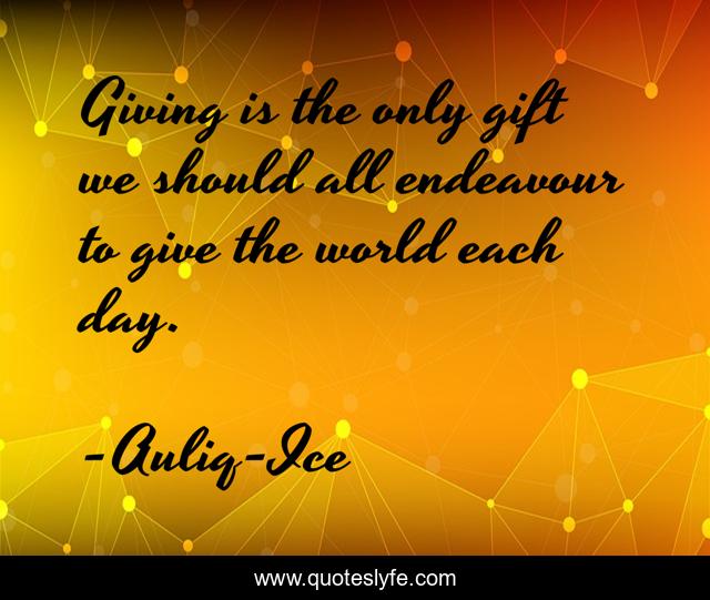 This page presents the quote "Giving is the only gift we should all endeavour to give the world each day.". Author of this quote is Auliq-Ice. This quote is about giving, charity, helping-others,.