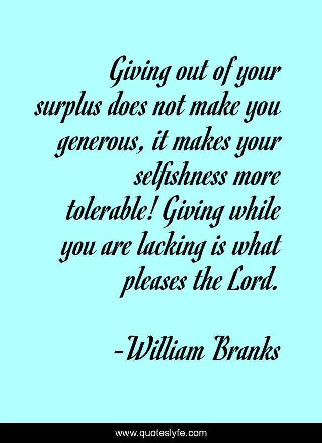 This page presents the quote "Giving out of your surplus does not make you generous, it makes your selfishness more tolerable! Giving while you are lacking is what pleases the Lord.". Author of this quote is William Branks. This quote is about tithing, generosity, sacrifice, christianity,.