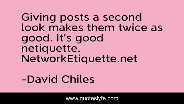 This page presents the quote "Giving posts a second look makes them twice as good. It's good netiquette. NetworkEtiquette.net". Author of this quote is David Chiles. This quote is about etiquette, social-media, rules-for-netiquette, social-networking, status-update, internet-etiquette, netiquette-rules, netiquette, rules-of-netiquette,.