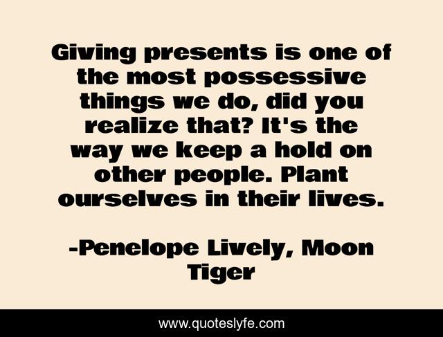 This page presents the quote "Giving presents is one of the most possessive things we do, did you realize that? It's the way we keep a hold on other people. Plant ourselves in their lives.". Author of this quote is Penelope Lively, Moon Tiger. This quote is about gifts, possession, ties,.