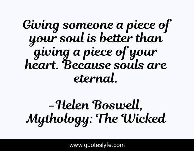 This page presents the quote "Giving someone a piece of your soul is better than giving a piece of your heart. Because souls are eternal.". Author of this quote is Helen Boswell, Mythology: The Wicked. This quote is about guardian-angels, soulmates, souls, demons,.