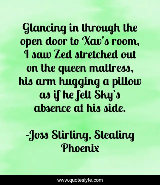 This page presents the quote "Glancing in through the open door to Xav’s room, I saw Zed stretched out on the queen mattress, his arm hugging a pillow as if he felt Sky’s absence at his side.". Author of this quote is Joss Stirling, Stealing Phoenix. This quote is about stealing-phoenix, zed, phee, benedict, sky, phoenix,.