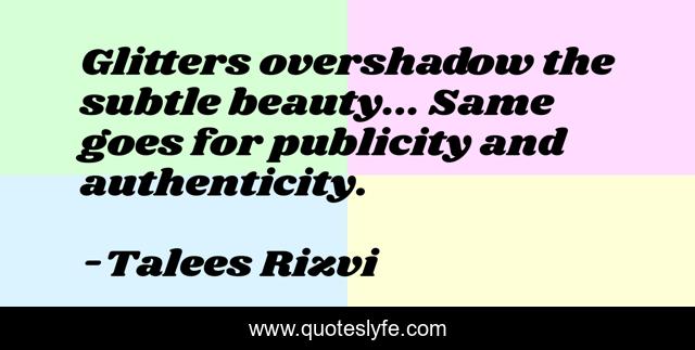 This page presents the quote "Glitters overshadow the subtle beauty... Same goes for publicity and authenticity.". Author of this quote is Talees Rizvi. This quote is about publicity, advertising, beauty,.