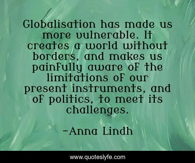 "Anna Lindh Quotes." Quoteslyfe.com, 2025. Sat. 06 Dec. 2025. <https://www.quoteslyfe.com/quote/Globalisation-has-made-us-more-vulnerable-It-318343>.