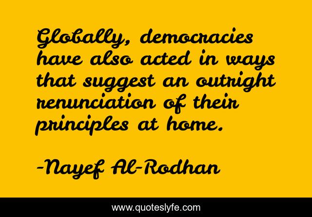 This page presents the quote "Globally, democracies have also acted in ways that suggest an outright renunciation of their principles at home.". Author of this quote is Nayef Al-Rodhan. .