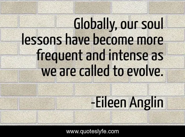 This page presents the quote "Globally, our soul lessons have become more frequent and intense as we are called to evolve.". Author of this quote is Eileen Anglin. This quote is about evolve, evolution, global-awakening, spiritual-growth, evolved-consciousness, spiritual, soul, spirituality, global-citizen,.