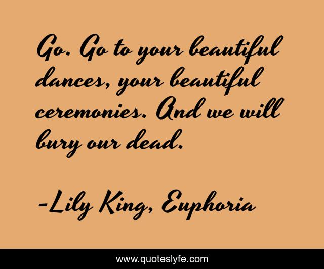 This page presents the quote "Go. Go to your beautiful dances, your beautiful ceremonies. And we will bury our dead.". Author of this quote is Lily King, Euphoria. This quote is about loss, life, moving-forward,.